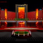 Con 40 metros de ancho, 20 de fondo, 20 de altura en su parte central y 296 metros cuadrados de pantalla, un millar de bombillas y tecnología led y un giratorio en su parte frontal, este impresionante escenario contará con dos grandes pasarelas que rematarán el espacio, conduciendo a dos escaleras de caracol que dirigen a simbólicas palmeras doradas, fuentes de agua e imágenes de una ciudad vinculada con la diversión.