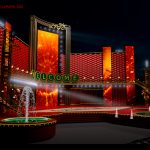 · Tonos rojos, negros y dorados juegan en un espacio rematado por dos grandes pasarelas, simbólicas palmeras doradas fuentes de agua e imágenes de una ciudad vinculada con la diversión