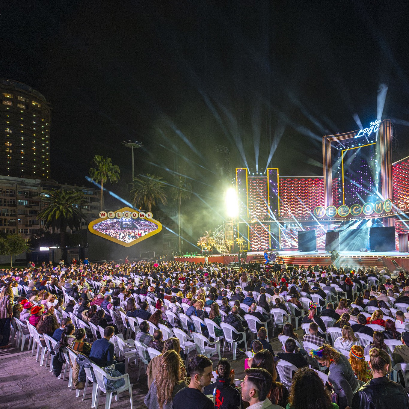 El arquitecto Carlos Santos volvió a ponerse al frente de la escenografía del Carnaval de «Las Vegas». Inspirado en el icónico cartel “Welcome to fabolous Las Vegas”, el recinto del parque Santa Catalina se transformó en «Bienvenidos al Hotel LPGC Palace», reproduciendo los elementos del inolvidable neón en el hall de un hotel directamente conectado con el espectáculo y la fiesta en tonalidades rojas, negras y oro, evocando el lujo y el glamour de Las Vegas.