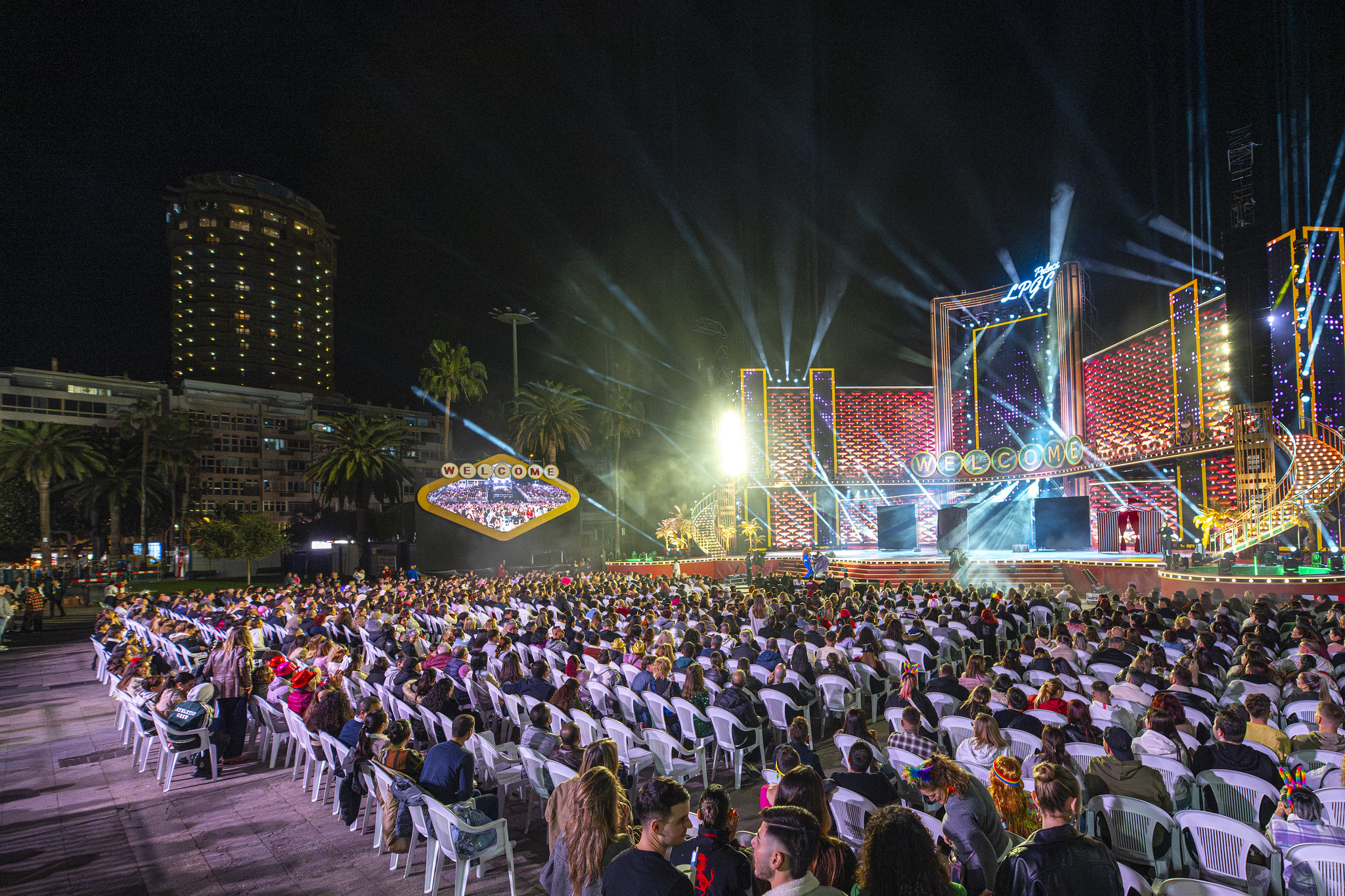El arquitecto Carlos Santos volvió a ponerse al frente de la escenografía del Carnaval de «Las Vegas». Inspirado en el icónico cartel “Welcome to fabolous Las Vegas”, el recinto del parque Santa Catalina se transformó en «Bienvenidos al Hotel LPGC Palace», reproduciendo los elementos del inolvidable neón en el hall de un hotel directamente conectado con el espectáculo y la fiesta en tonalidades rojas, negras y oro, evocando el lujo y el glamour de Las Vegas.
